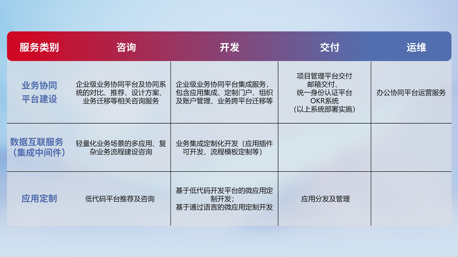针对钉钉、、、、企微、、、、IDaas等平台级产品提供产品的规划、、、方案、、交付、、、定制化开发等服务,,,,实现如统一协同办公、、、、智能客户服务、、混合会议管理、、、智能数据查询、、、等业务场景,,,,实现数字化转型。。